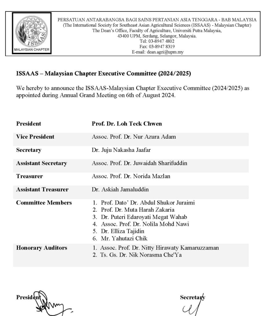 The Executive Committee of the Malaysia Chapter of the International Society for Southeast Asian Agricultural Sciences (ISSAAS) is responsible for managing the activities and operations of the chapter. The committee oversees the organisation’s strategic initiatives, coordinates scientific and professional engagements, and supports the development of agricultural science collaboration within the region.